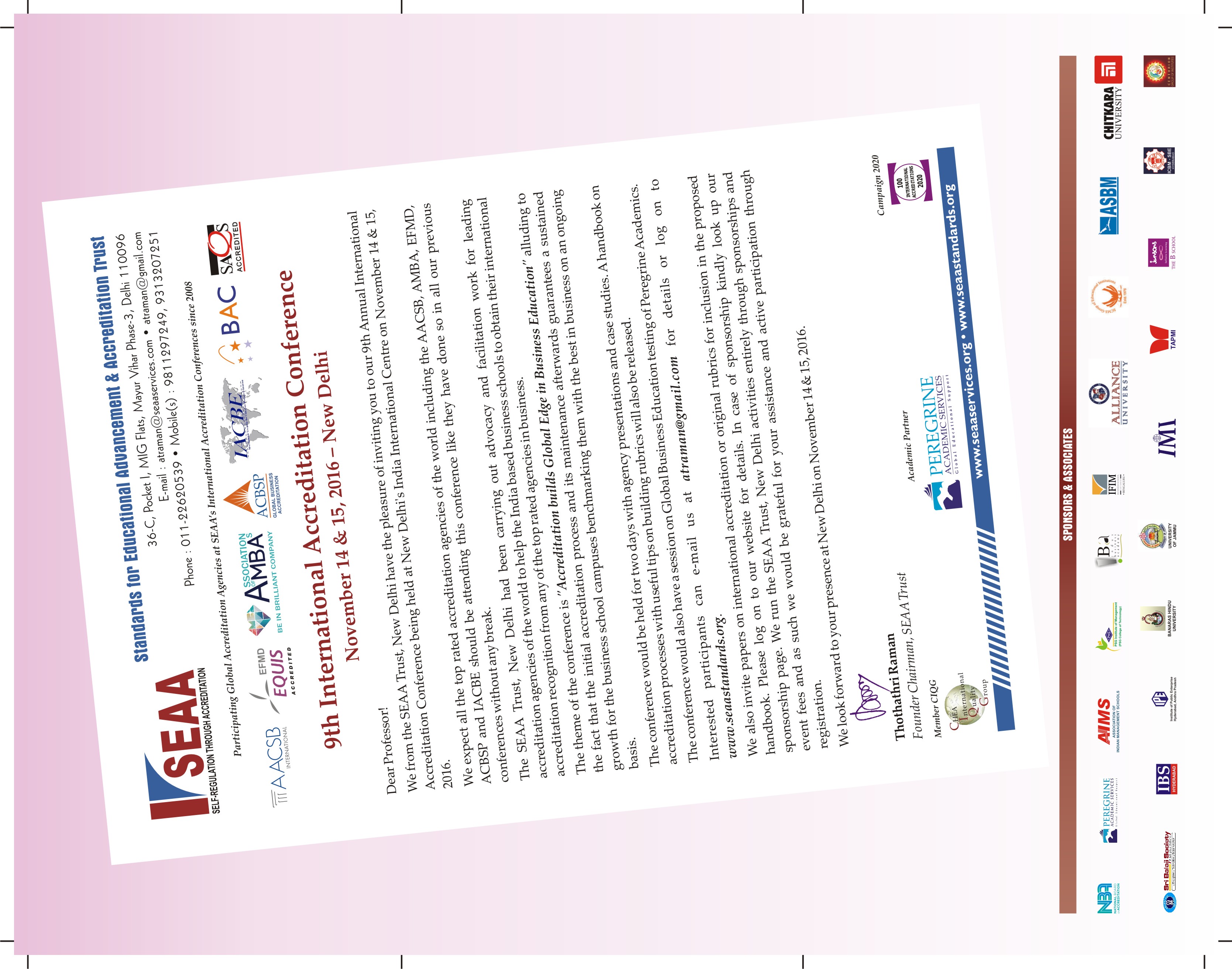 Criteria Requirements for Observer: Standards for Educational Advancement & Accreditation (SEAA) Trust is an unique non profit registered organisation operating from 2008 for advocacy of international benchmarks of quality through independent peer reviewed accreditation for business education. We have been working closely with AACSB, EFMD, AMBA, ACBSP, IACBE, BAC, SAQS among others and also with the local government accreditation agency National Board of Accreditation (NBA) in the area of technical education advocacy. Our website is www.seaastandards.org. Our annual conference has been bringing together all the world's leading accreditation agencies on the same platform year on year for the past eight years. Our 9th conference is scheduled in November 14 & 15, 2016 at New Delhi. Through our advocacy effort we bring the knowledge of accreditation process to the user group of business schools in India. Our work partly contributed to total accreditation done in India at global level from just 1 to 50 during our organisation's existence. We carried out 100 by 2015 campaign to get at least a 100 business schools under the accreditation fold for processing their application and having achieved our target we have launched another similar campaign to get at least 100 business schools accredited by 2020.